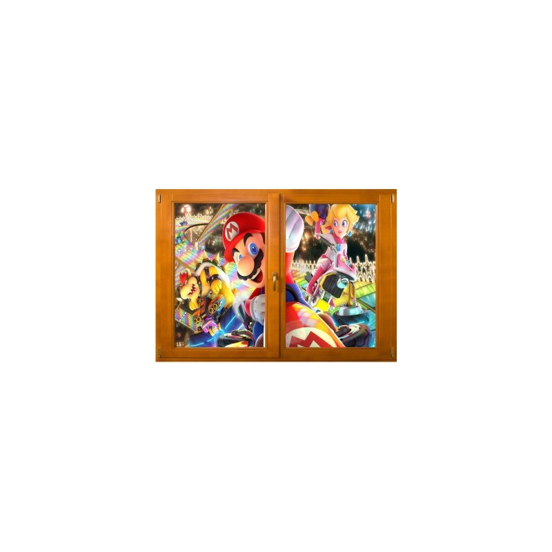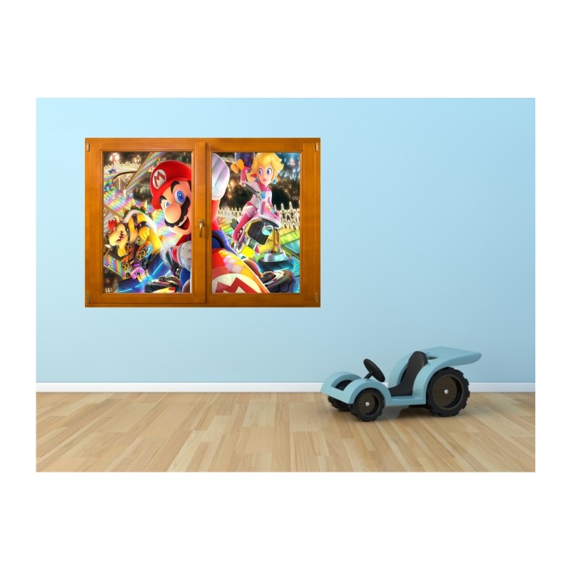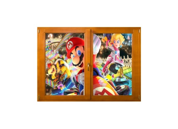 Stickers trompe l'oeil fenêtre bois Mario Kart.