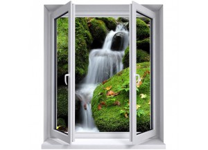 Stickers de décoration murale en trompe l'oeil d'une fenêtre avec une petite cascade entourée d'une magnifique végétation.