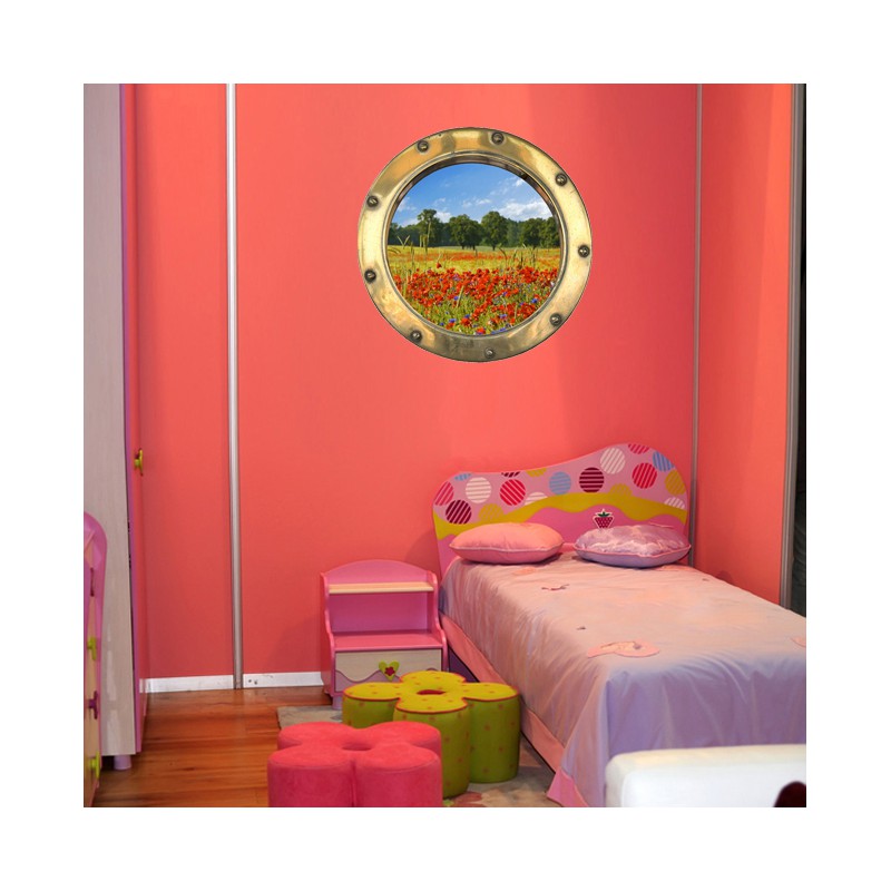 Sticker de décoration murale en trompe l'oeil de hublot avec vue sur un champ de coquelicots.