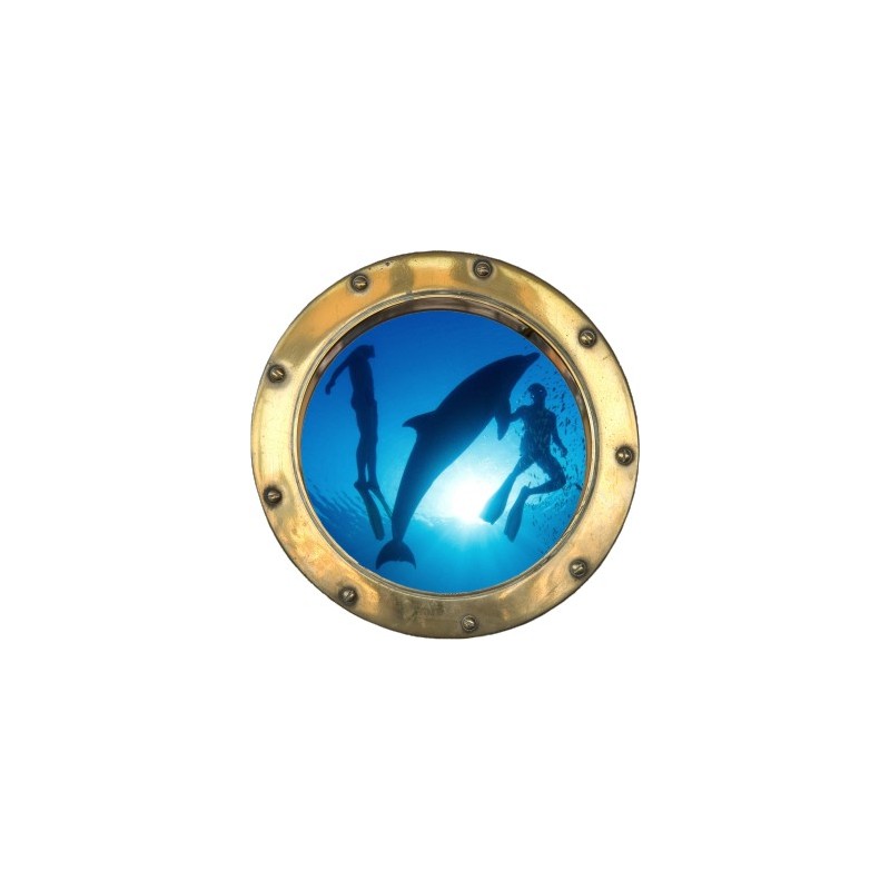 Sticker de décoration murale en trompe l'oeil de hublot doré Plongeurs et Dauphins. Partez nager en compagnie des dauphins simplement avec l'autocollant trompe l'oeil hublot doré Plongeurs et Dauphins.