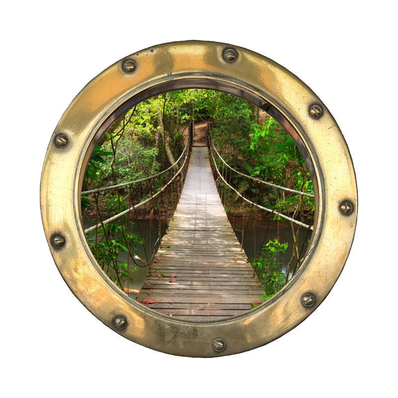 Sticker de décoration murale en trompe l'oeil d'un hublot avec vue sur un petit pont de bois traversant la jungle.